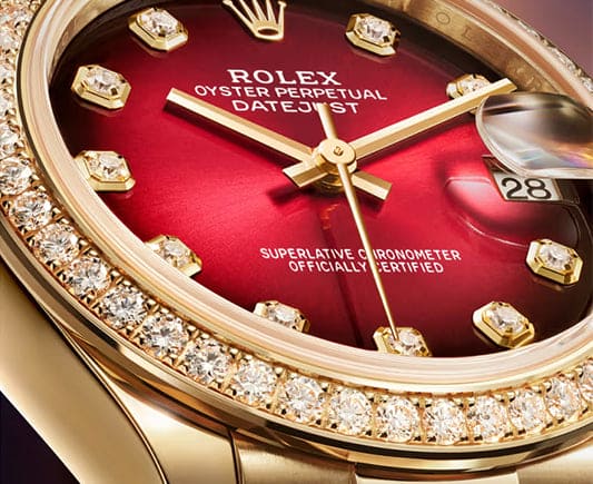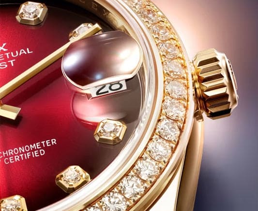 The 31 mm Oyster case of the Datejust 31 is guaranteed waterproof to a depth of 100 metres (330 feet). The middle case of the version presented is crafted from a solid block of 18 ct yellow gold. Its case back, edged with fine fluting, is hermetically screwed down with a special tool employed by approved watchmakers.